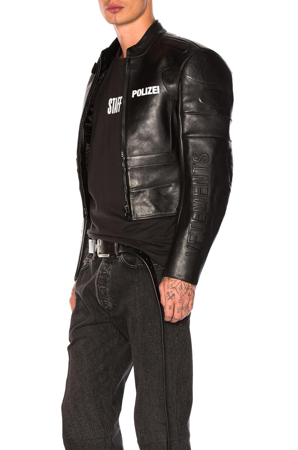 Vetements spring summer 2017 motorcycle style jacket comes in smooth , structured black leather with a band collar, zip up front, white polizei chest print, logo velcro tab, side tabs, logo patch sleeves, and white letter patch back.